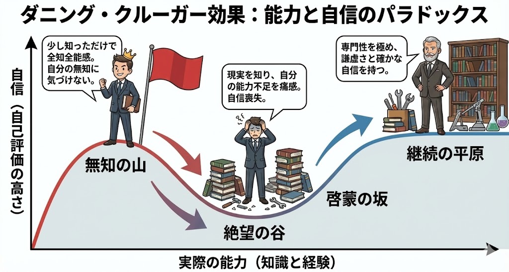 実はこれこそが、ダニング・クルーガー効果の第一段階、通称「馬鹿の山(Mount Stupid)」です。