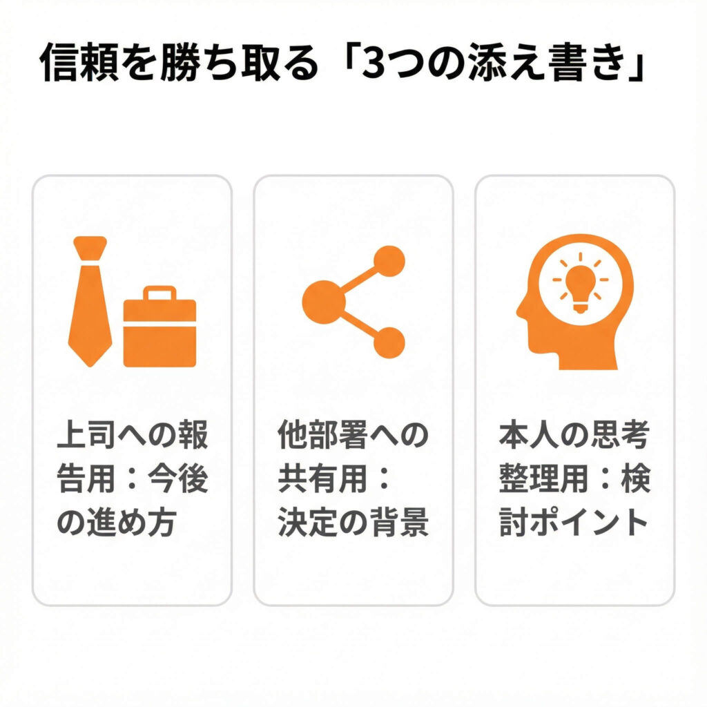 - 理由:会議に出ていない人にも、転送するだけで意図が伝わるようにするため。