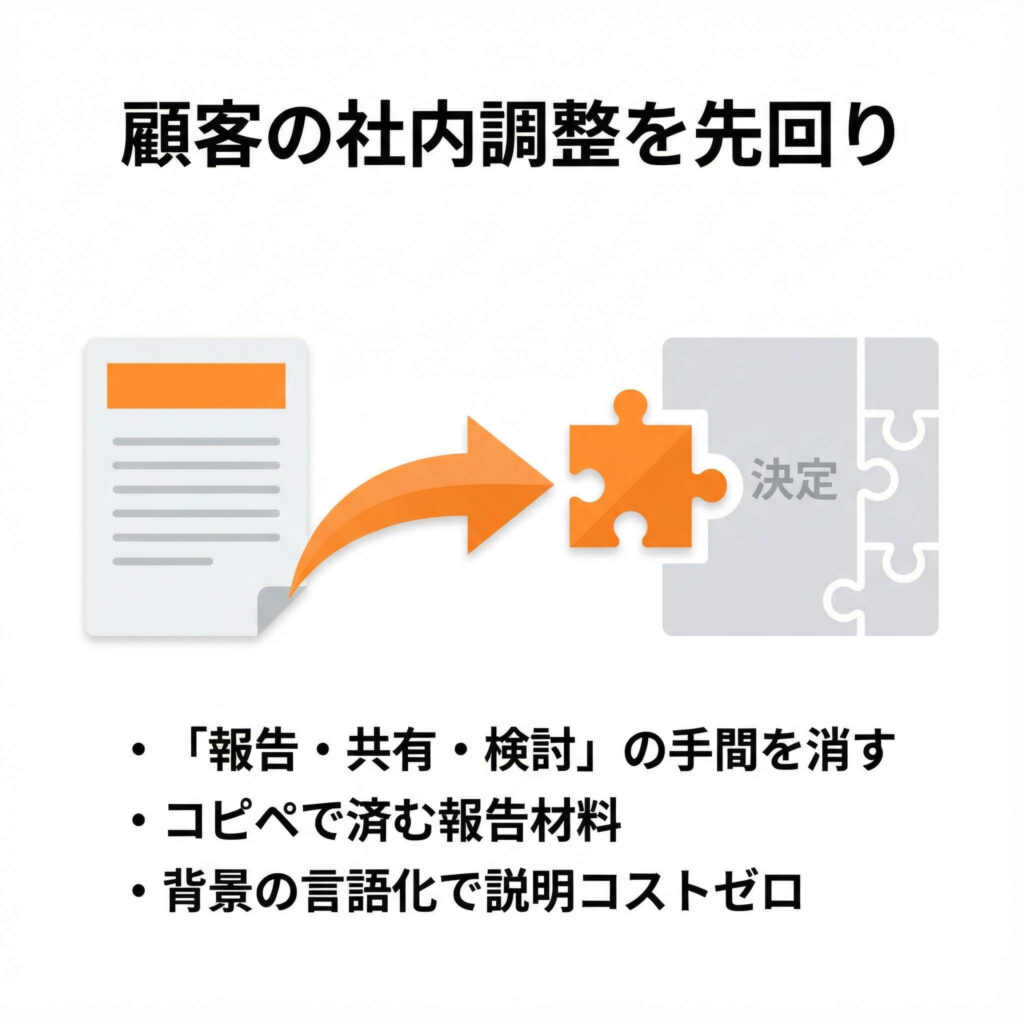 ポイントは、お客様が社内で「報告・共有・検討」をする際の手間を、あなたが先回りして消してあげることです。