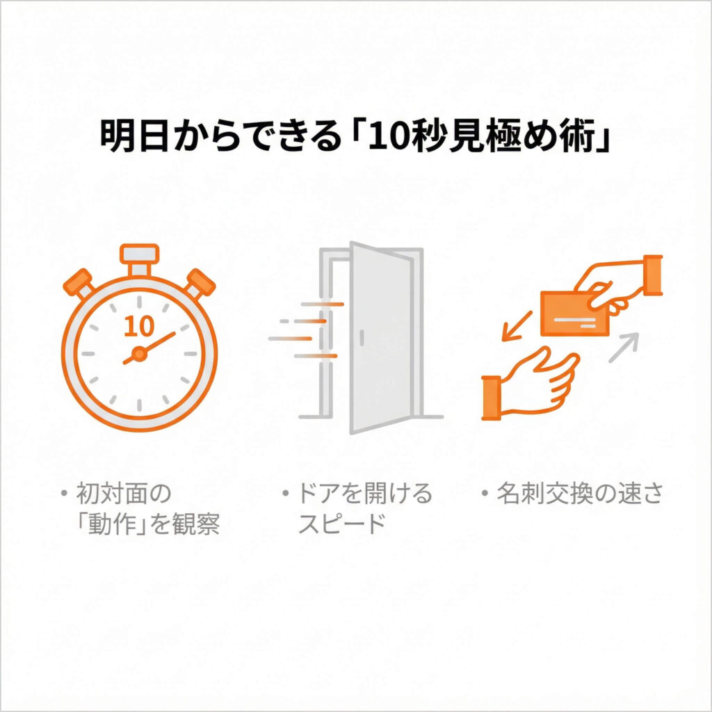 • 一歩目:「ドアを開けるスピード」と「名刺交換の速さ」をチェック。