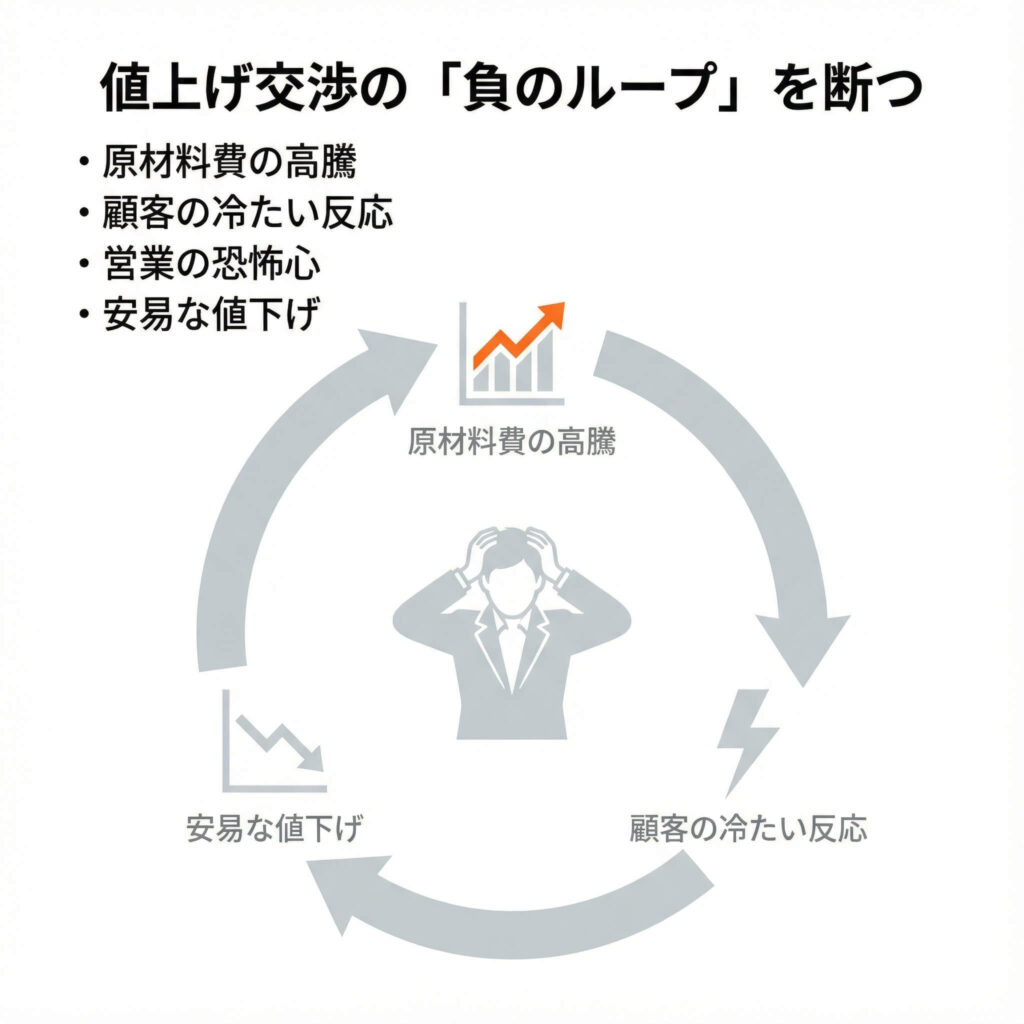 会社に戻れば社長から「なんで値上げしてこなかったんだ!」と詰められ、現場ではお客様から「安くして当たり前」と思われてしまう。これは、多くの中小企業の営業現場で起きている、悲劇的な「負のループ」です。