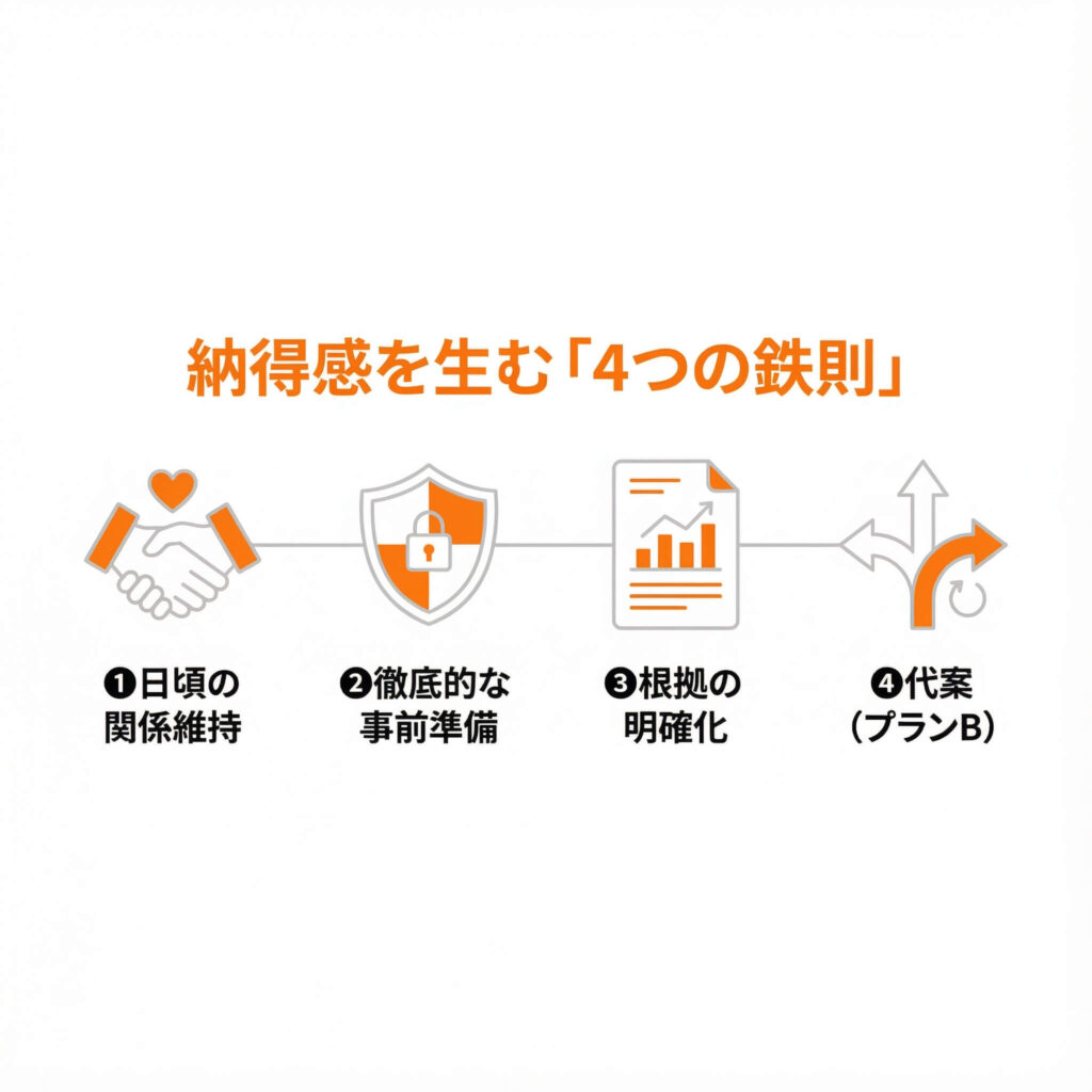 もし、あなたが若手で、決裁権を持つキーマン(社長や部長)との関係が薄いなら、日頃から上司を連れて挨拶に行き、「上司の顔」を売っておくこと。これをサボって、土壇場での交渉は成立しません。関係を「作る」だけでなく、「維持する」泥臭さが不可欠なのです。