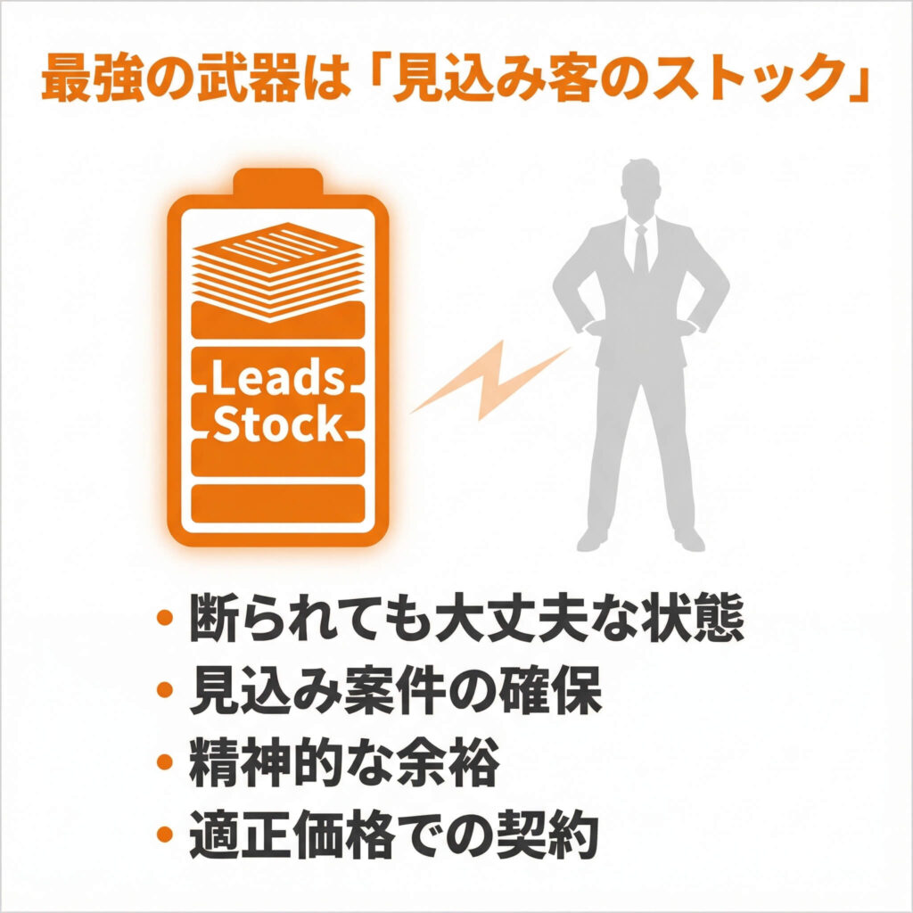 ここまで、交渉のテクニックをお伝えしてきましたが、実はこれら全てを支える、もっと根本的な「最強のノウハウ」があります。 それは、見込み客や案件の「ストック」を十分に持っておくことです。