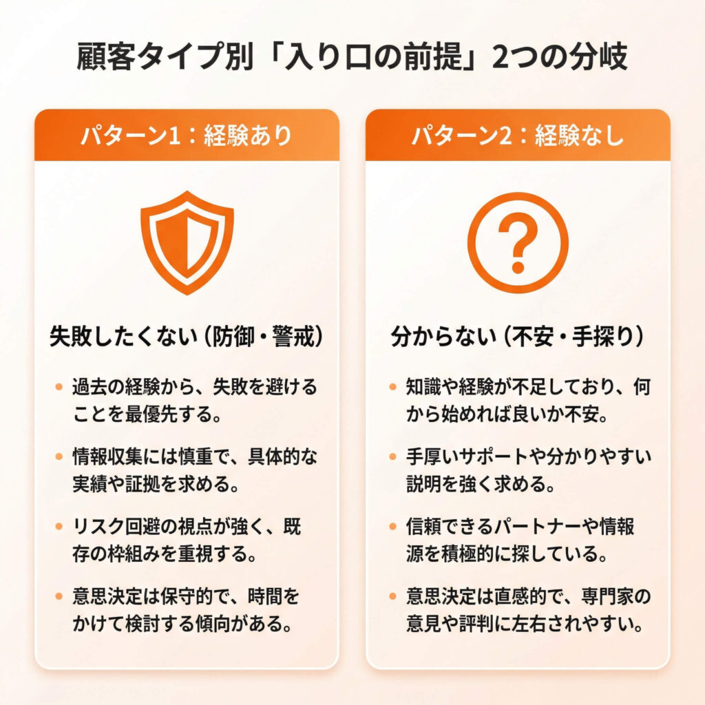 営業における関係構築の成否は、実は最初の出会い、つまり「入り口」で大きく左右されます。そして、その入り口で最も重要になるのが、「お客様が過去にどんな購買体験をしてきたか」という前提なのです。