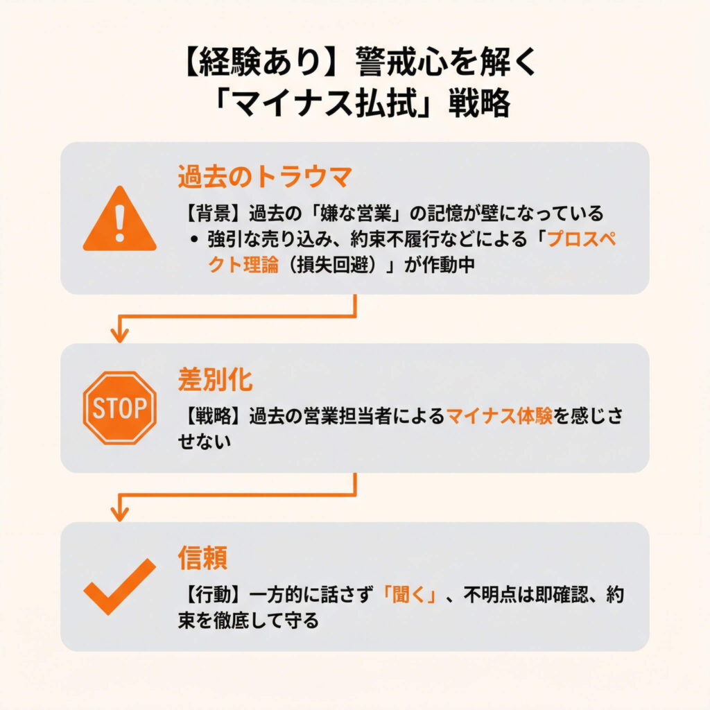 答えはシンプルです。過去の他の営業担当者がやってきたであろうマイナス体験を、絶対に感じさせないことです。