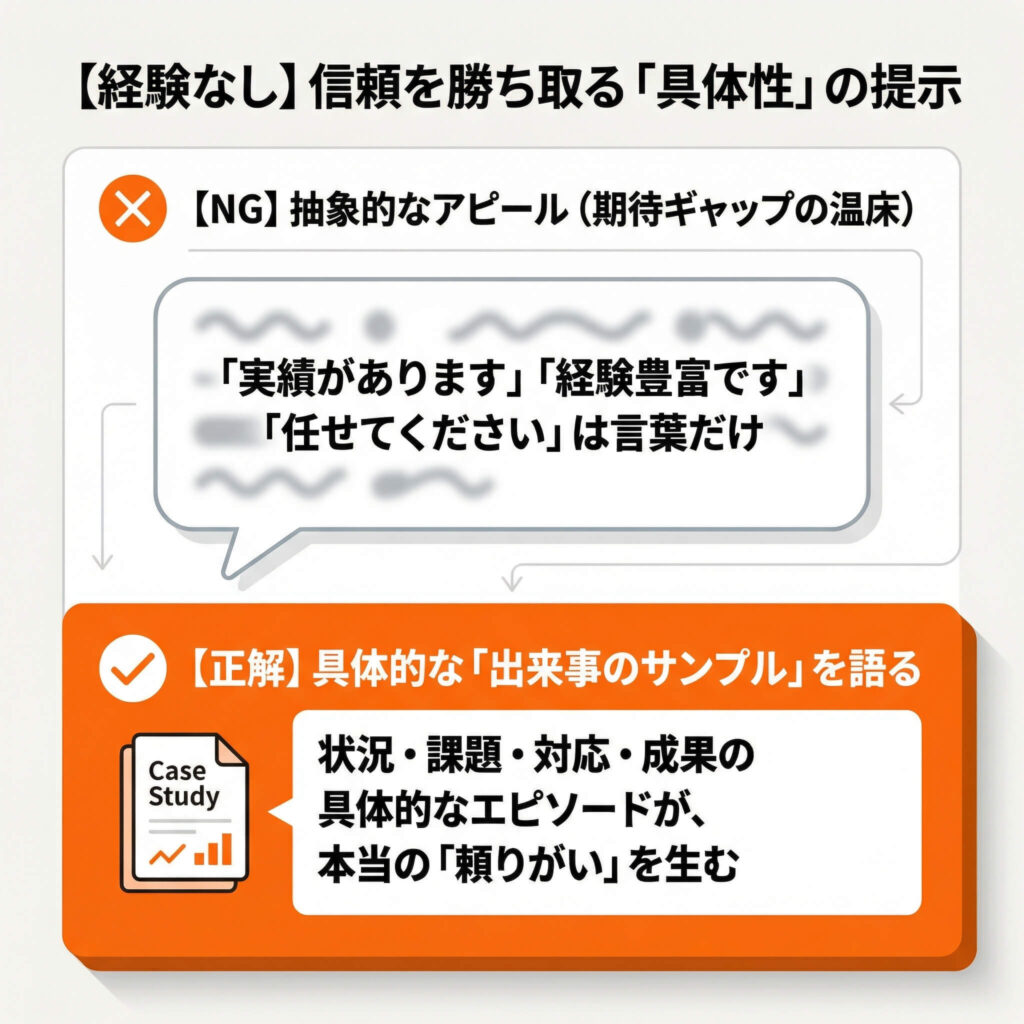 抽象的に「経験があります」と言うのではなく、具体的に「こういう出来事がありました」「こういうお客様に、こういうことをしました」と伝える。これが、購買経験のないお客様に「頼りになる」と感じてもらう、最も確実な方法なのです。