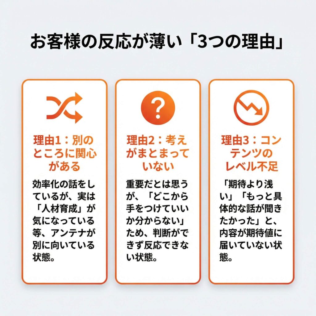 お客様の反応が薄いのには、それなりの理由があります。まずは、その理由を理解することから始めましょう。