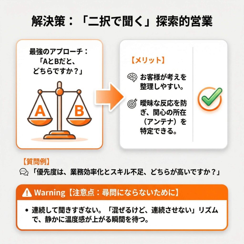 このように、二択で聞くことで、お客様は自分の考えを整理しやすくなり、明確な反応を返しやすくなるのです。