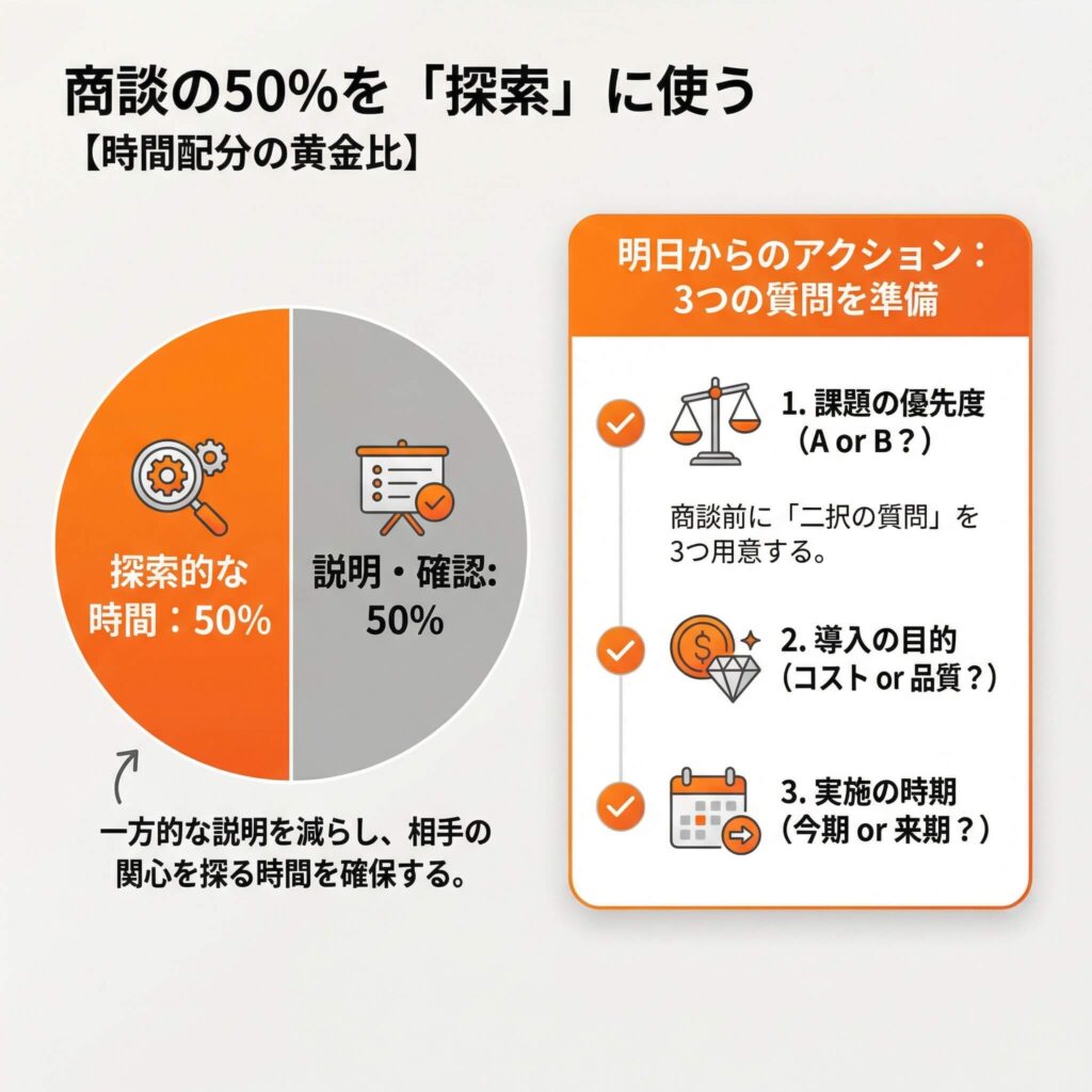 ですから、私のおすすめは、商談時間の全体が100%だとすると、少なくとも50%を、探索的な時間の使い方にするということです。