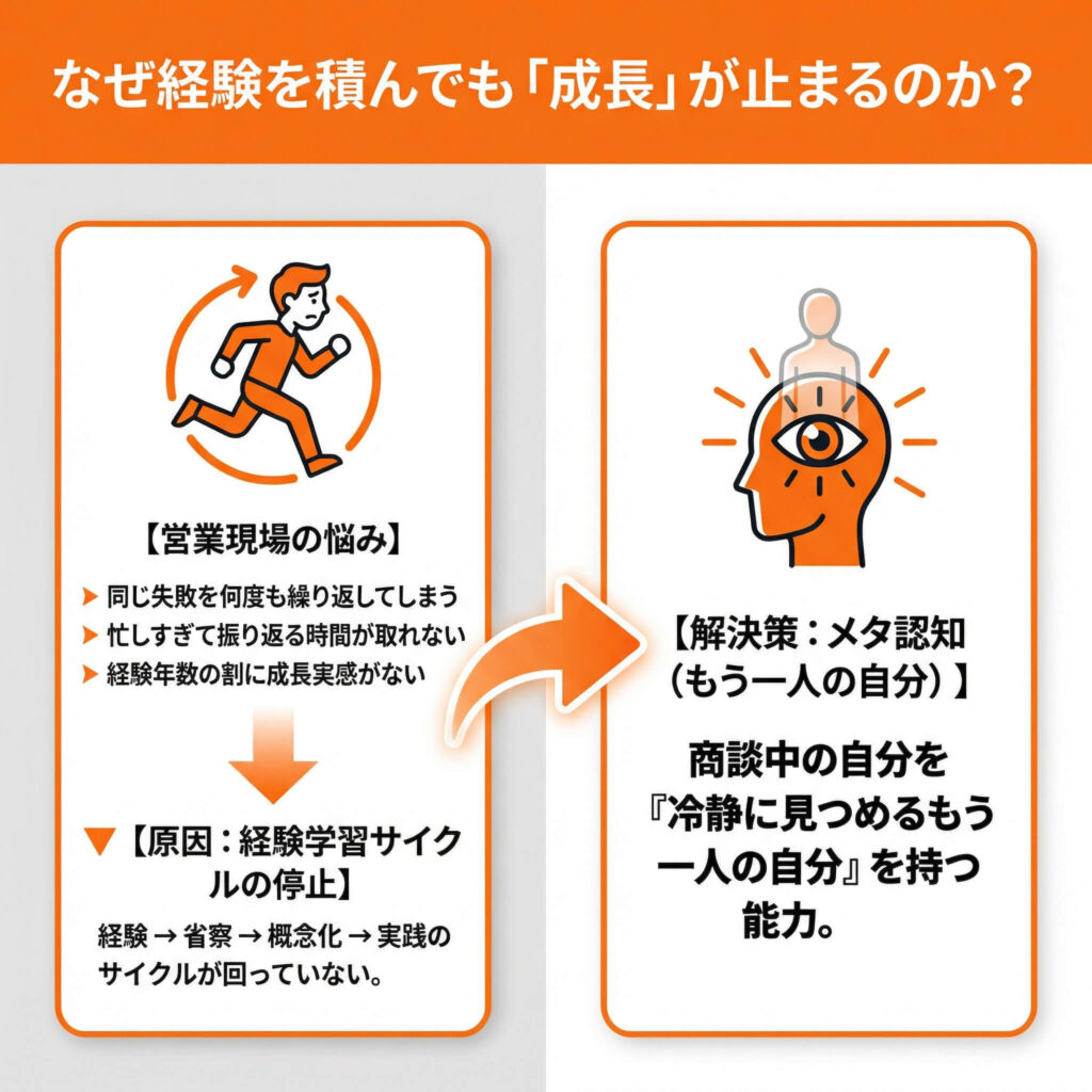営業の成長スピードを上げるためには、経験を積むだけでは不十分です。その経験を振り返り、学びに変え、次に活かす。この「メタ認知」の習慣が、成長の鍵なのです。