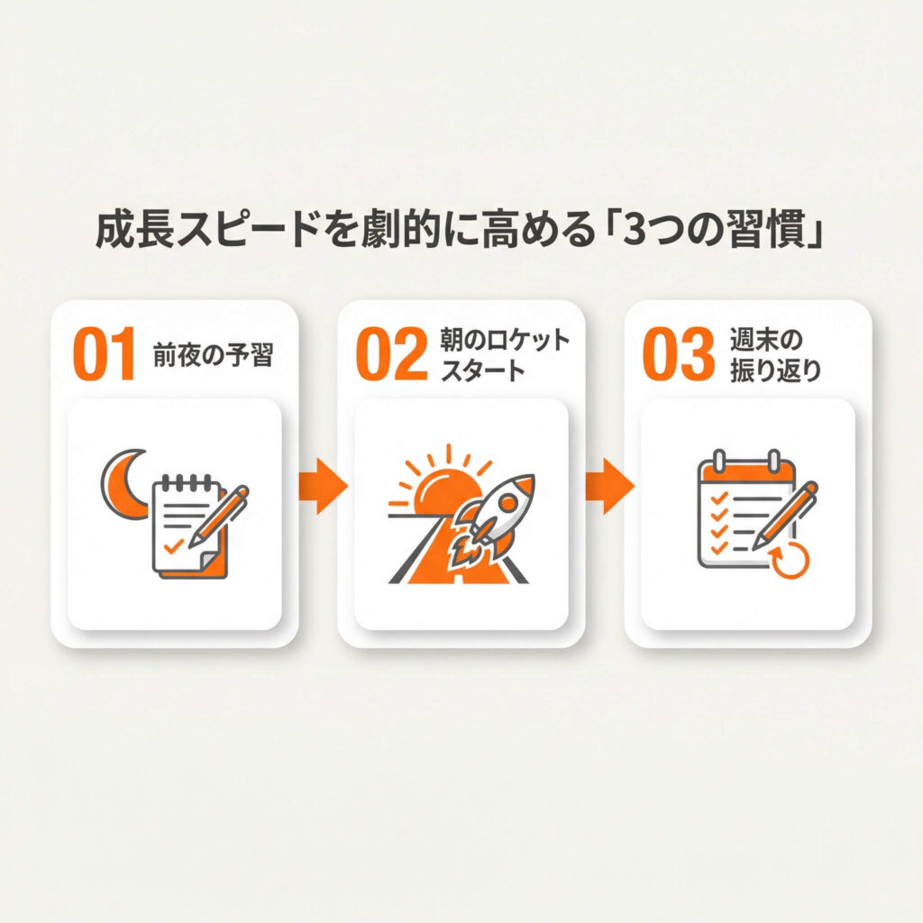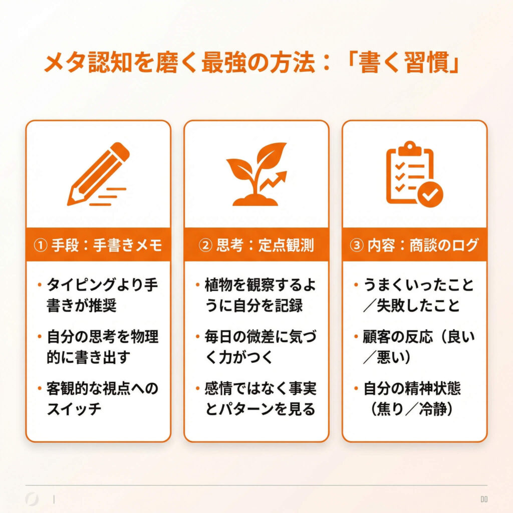 ここまでの話をまとめると、営業の成長スピードを上げるメタ認知を磨くための習慣は、以下の3つになります。