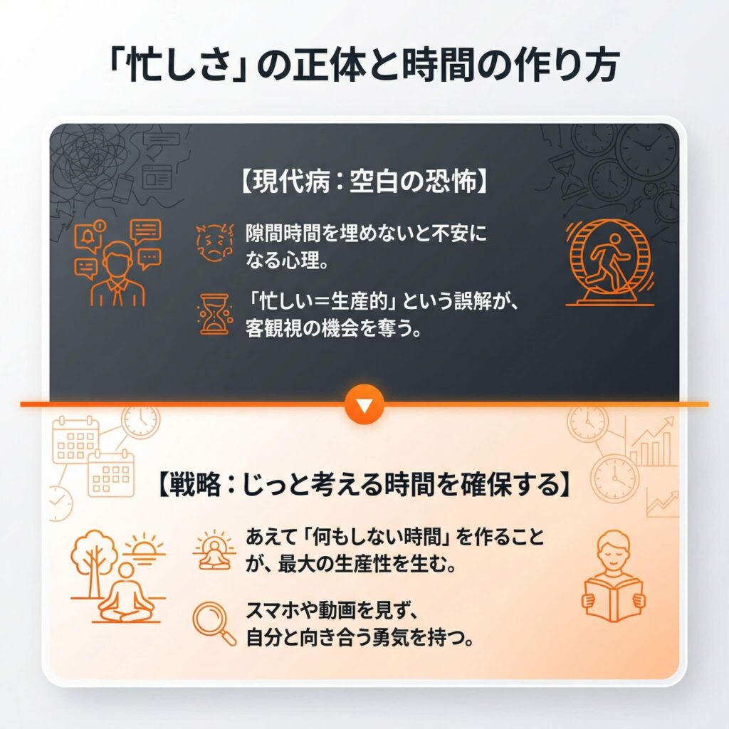 忙しい現代において、メタ認知を磨くために最も重要なのは、隙間時間を「埋めない」勇気です。