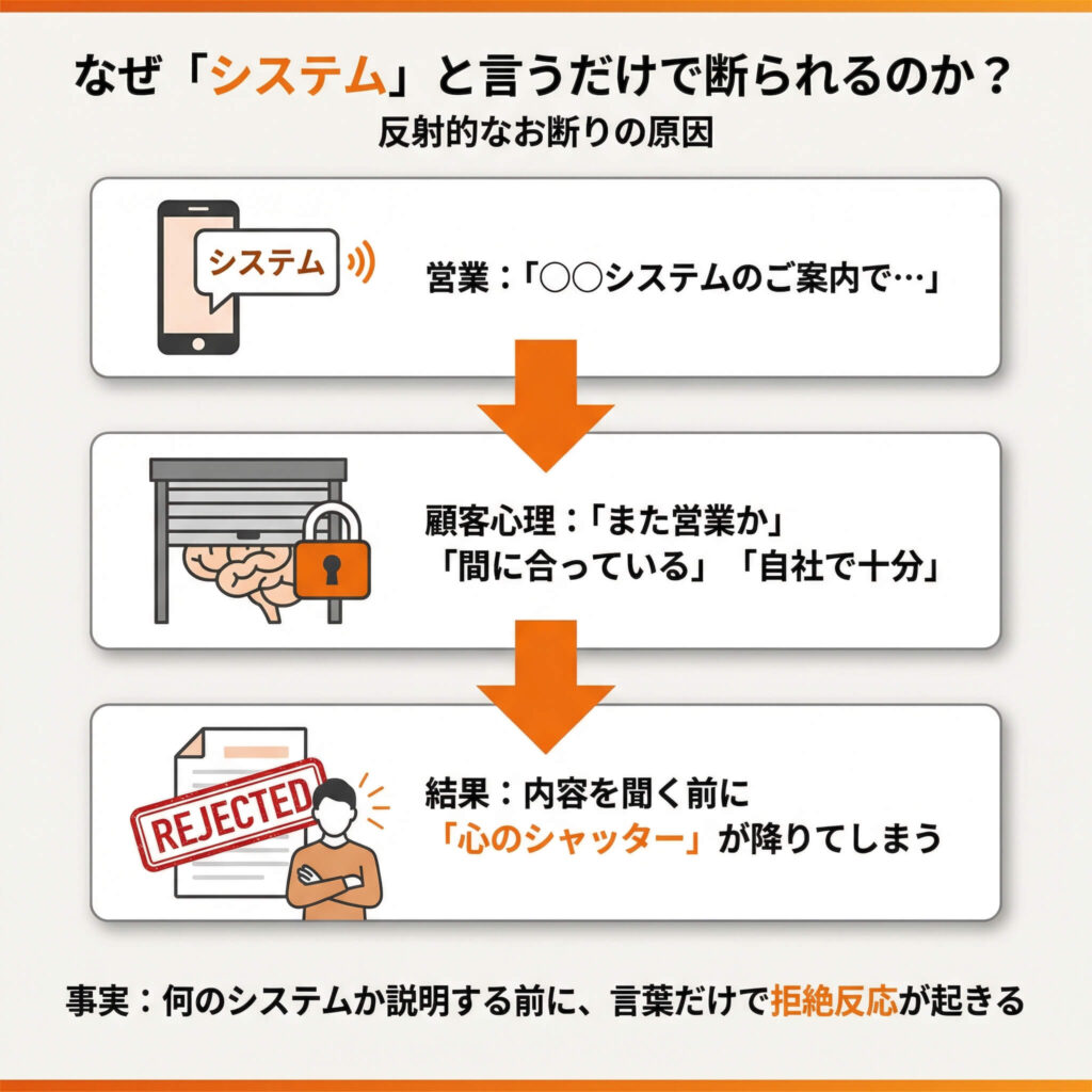 これが起こるにもかかわらず、「システム」という言葉が、反射的に相手のお断りを引き出してしまっているのです。
