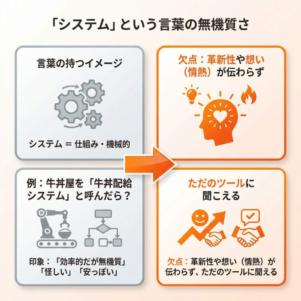 しかし、その革新的で素晴らしいことをやっているという取り組みや思いを、「システム」という言葉に置き換えないでください。