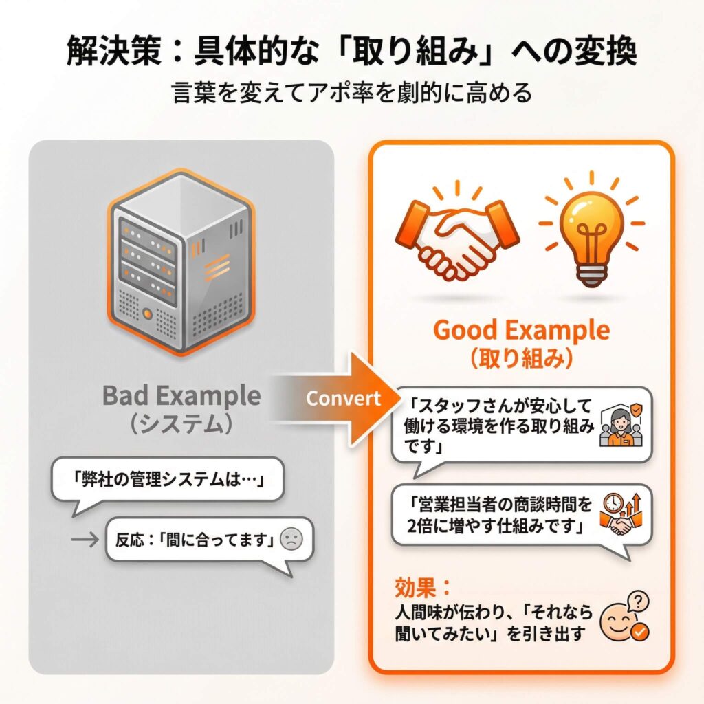 しかし、言葉を変えるだけで、アポイント率は劇的に上がります。お客様の心に響く表現を使うことで、興味を引き出し、商談の機会を増やすことができるのです。