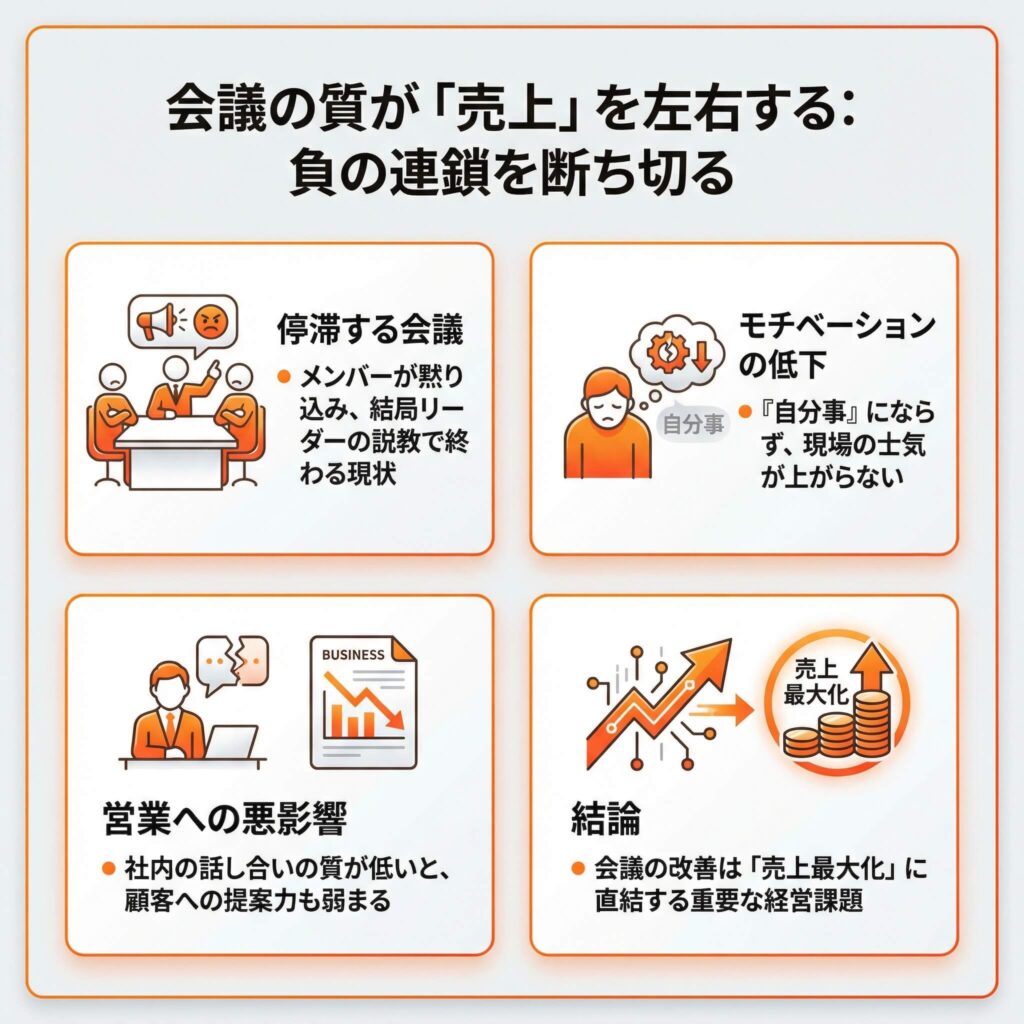 そんな悩みを抱えている経営者やマネジャーの方は多いのではないでしょうか。実は、社内の会議がうまくいかない会社は、外での営業活動でも苦戦し、なかなか受注に結びつかないという共通点があります。